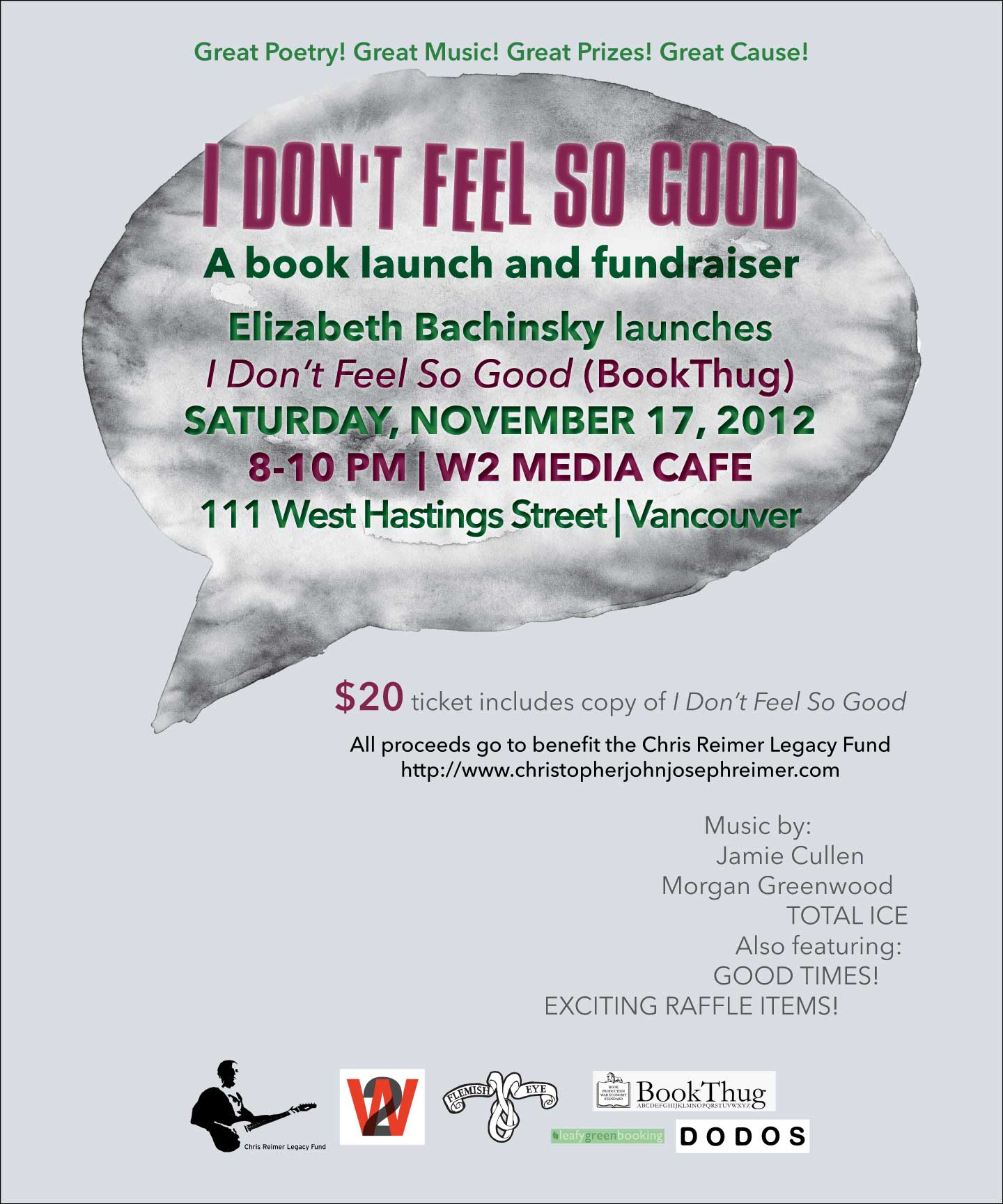 Thanks are also due to Elizabeth Bachinsky, who on November 17 launched her 4th poetry title, I Don’t Feel So Good (BookThug) at W2 Community Media Arts in Vancouver. Liz most generously decided to make the launch a fundraiser for the Chris Reimer Legacy Fund, and they raised over $900! Hearty thanks are also due to Dina del Bucchia, W2, Sean Cranbury, and musical guest stars TOTAL ICE, Jaime Cullen and Morgan Greenwood.